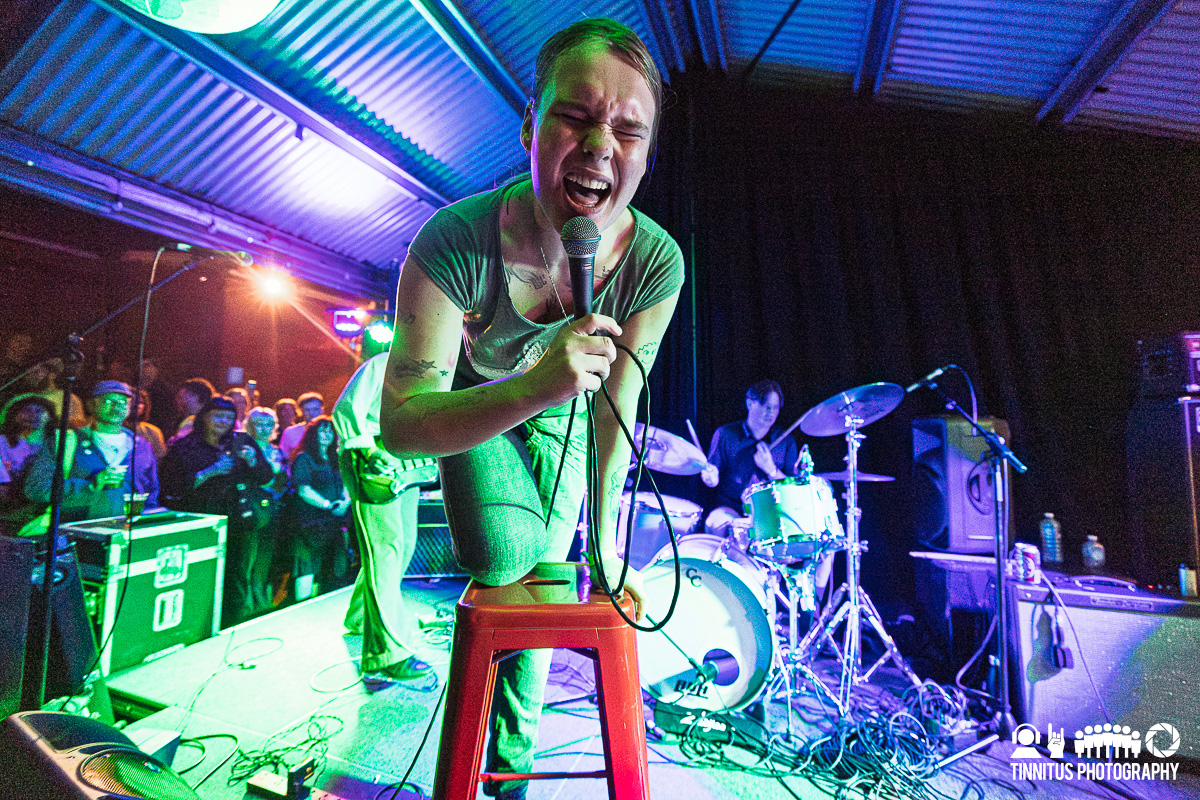 The lyric snippets of “Because the right is on the rise” and “It’s a bad time to be a Muslim/And it’s a bad time to be a Jew” from set opener “600 Pounds” were written in 2018 and sadly still very much relevant today. The band came out swinging and never let up. As the crowd got rowdier I put my camera away for safekeeping and in the process missed out on an epic photo. One guy jumped onto the short stage, jumped up and grabbed the pipe that was directly above the stage edge, wrapped his legs around it, and hanging horizontally above it all, gave the devil horns sign to the band before jumping back down below. It was that kind of energy, infectious and fun. Luckily, someone captured it