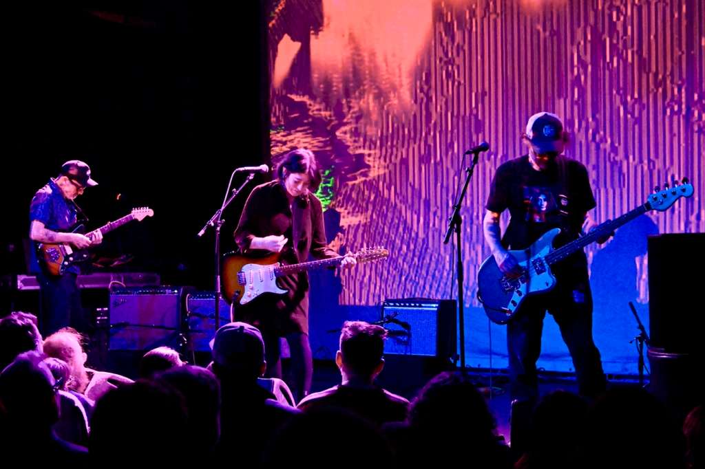 Last night at Music Hall of Williamsburg, Miki Berenyi (of dreampop legends Lush) returned to NYC with her Miki Berenyi Trio (MB3) in full for the first time, convincing her airplane-averse partner KJ “Moose” McKillop (also of their Britpop/shoegaze/post-punk supergroup Piroshka & the namesake/spectral guitarist of fantastic, but under-appreciated ‘90s London shoegaze pioneer band Moose) to play in the U.S. for the 1st time in 31 years (when Big Takeover founder Jack Rabid saw Moose open for Cocteau Twins & Luna), to join her and dynamic bassist/backing vocalist Oliver Cherer, who filled in for McKillop in June 2024 when MB3 played Webster Hall, to play the entirety of excellent debut LP Tripla, six Lush songs, and some non-LP singles, including closer “Stranger”, a great gothy collab with The Cure founding member Lol Tolhurst (who opened for MB3 on the previous U.S. tour) and his son Gray Tolhurst.