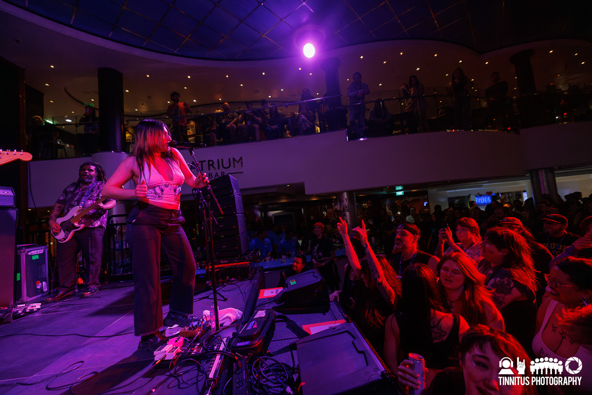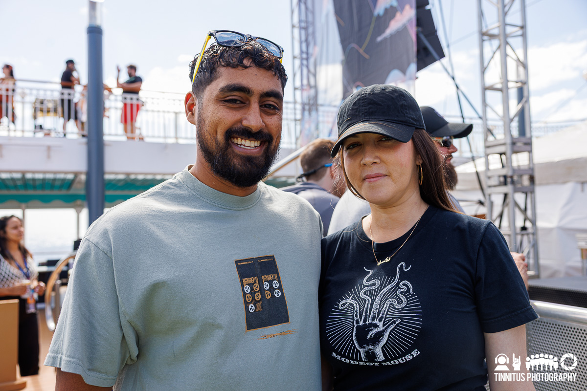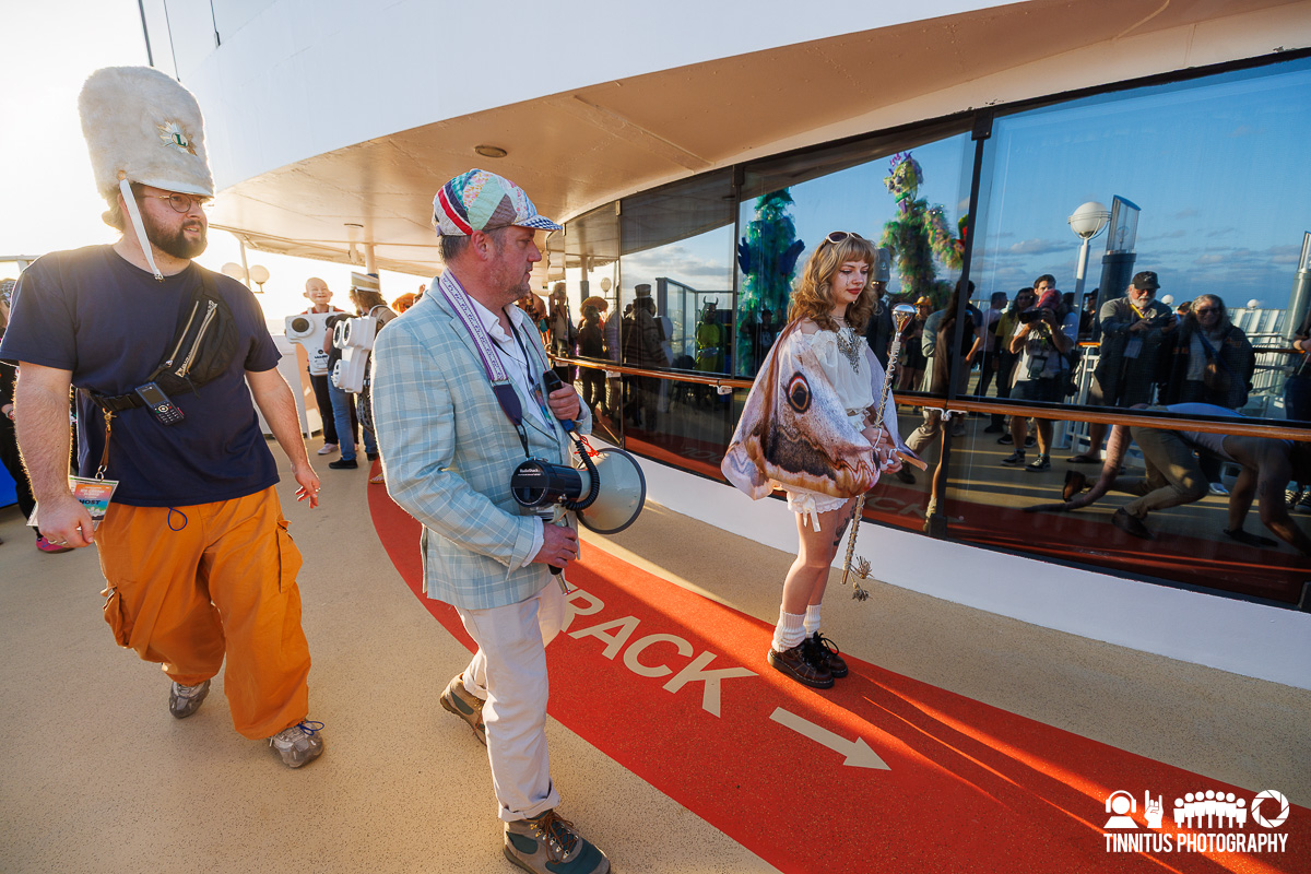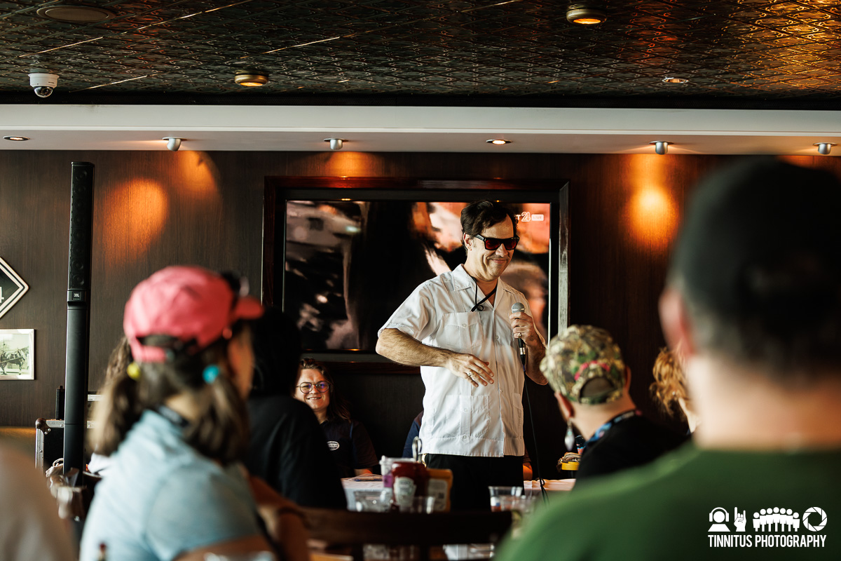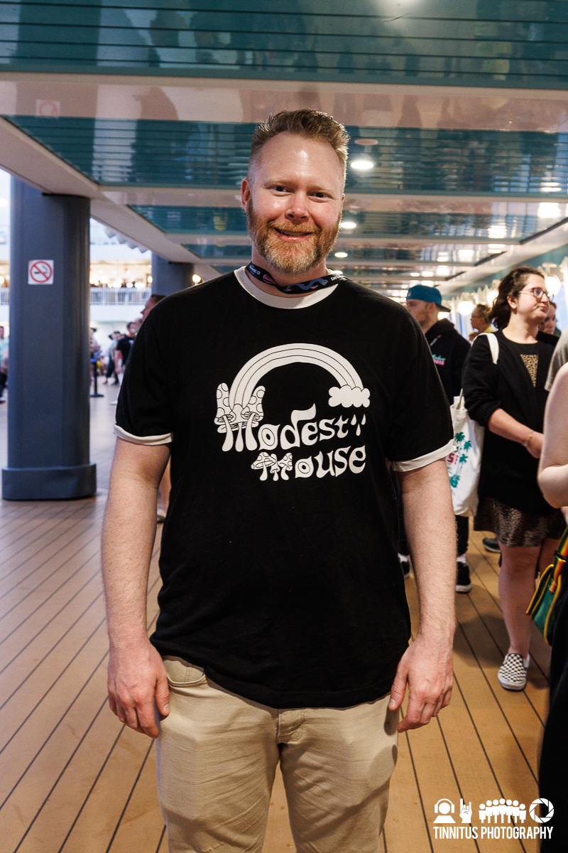 In addition to the ten bands and one comedian performing, there were plenty of other ways to spend your time that didn’t include staking out a space on the deck and reading a book, or drinking a piña colada in one of the hot tubs. Bingo sessions hosted by David Cross, trivia rounds emcee’d by Mannequin Pussy or Mattress, yoga sessions, autograph sessions with the bands, Brock delivering an MST3K-style live commentary (grab a bag of free popcorn as you find a seat in the theatre) to a screening of “The Devil’s Advocate,” late night DJ sets and karaoke sessions, getting a last minute tattoo, or throwing away money at the casino – there was no excuse for any bored downtime unless that’s what you were seeking. Additionally, enterprising fans were busy before the cruise, making any number of Modest Mouse-related tchotchkes ranging from stickers and 3D printed cockroaches and fridge magnets that they freely distributed to fellow fans. Oh, and during the Q&A session with Isaac, we learned that every question can be also answered with the word “Bass.”