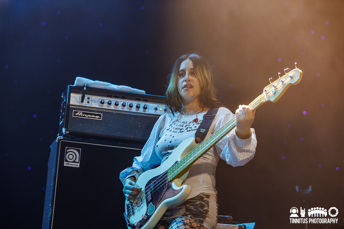 With FIDLAR a late scratch, that left Mannequin Pussy and Tropical Fuck Storm as the adrenaline merchants. Mannequin Pussy’s driving songs perfectly encapsulate their t shirt back design: Loud Bark Deep Bite. The many different stripes of their lineup echoed positivity and inclusivity, bringing a crowd to match.