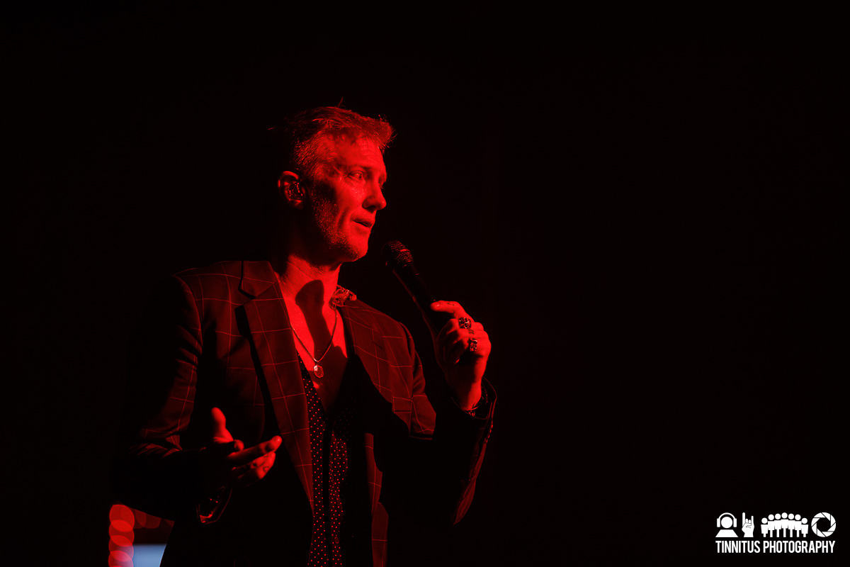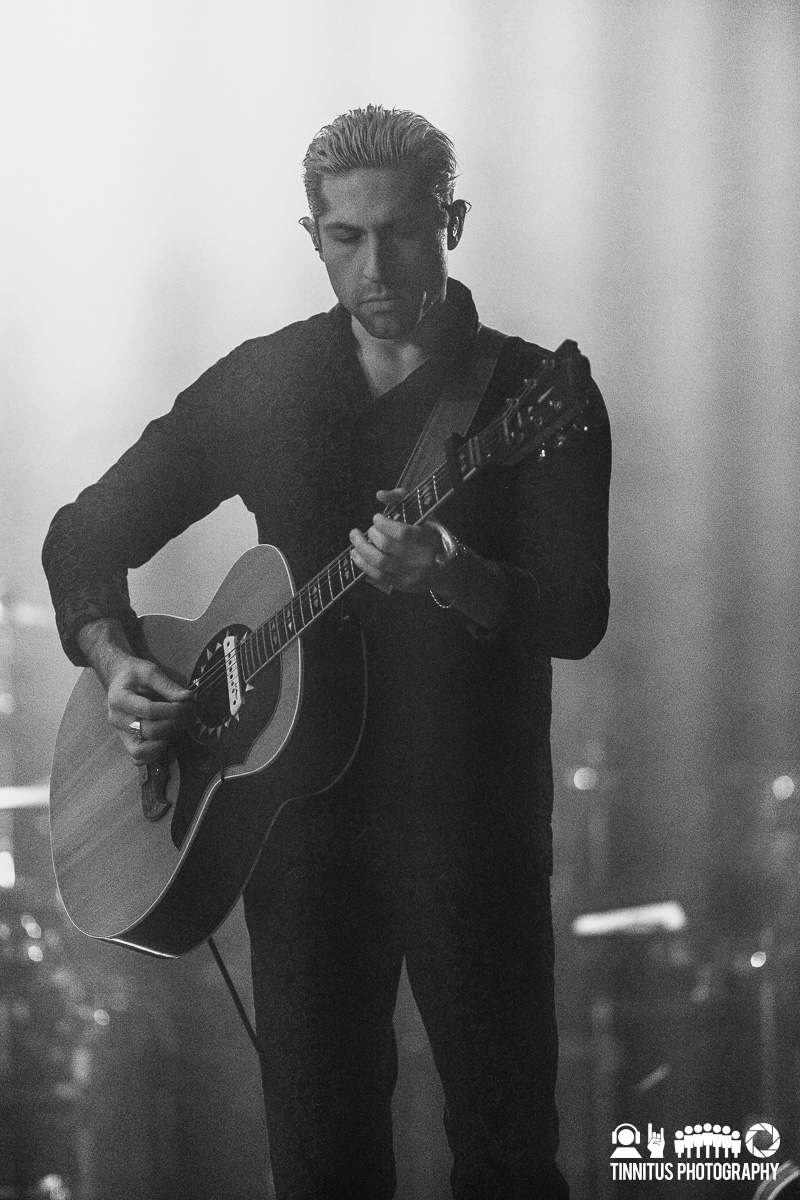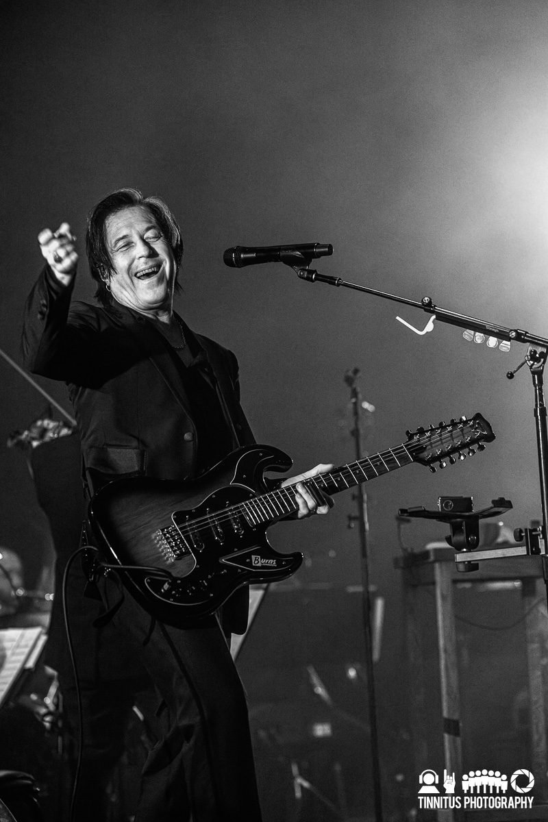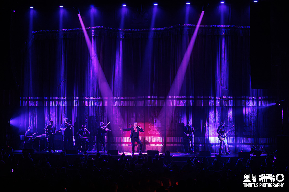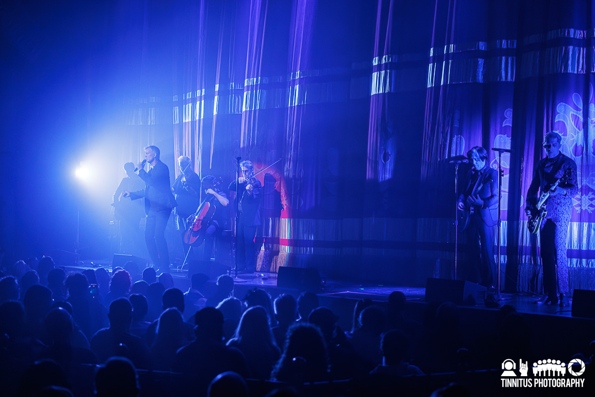 Encouraging ‘creative dress’ for attendees (and the band certainly led the way; I bet there were as many wardrobe cases as guitar road cases on this run), the band booked a handful of ornate theaters to present their vision, and Boston was one of the lucky dozen or so American stops with the booking at the Wang Centre. Before anyone came out on stage, a scrim covered most of the stage, leaving just a few feet to the edge. That was enough real estate for the band to set up camp laterally, along with a string trio. Bathed in pale blue light, Homme stalked the stage with a mic in one hand and a task light in the other, occasionally swinging it or holding it under his chin to create the kind of shadows one might find in a candlelit crypt.
