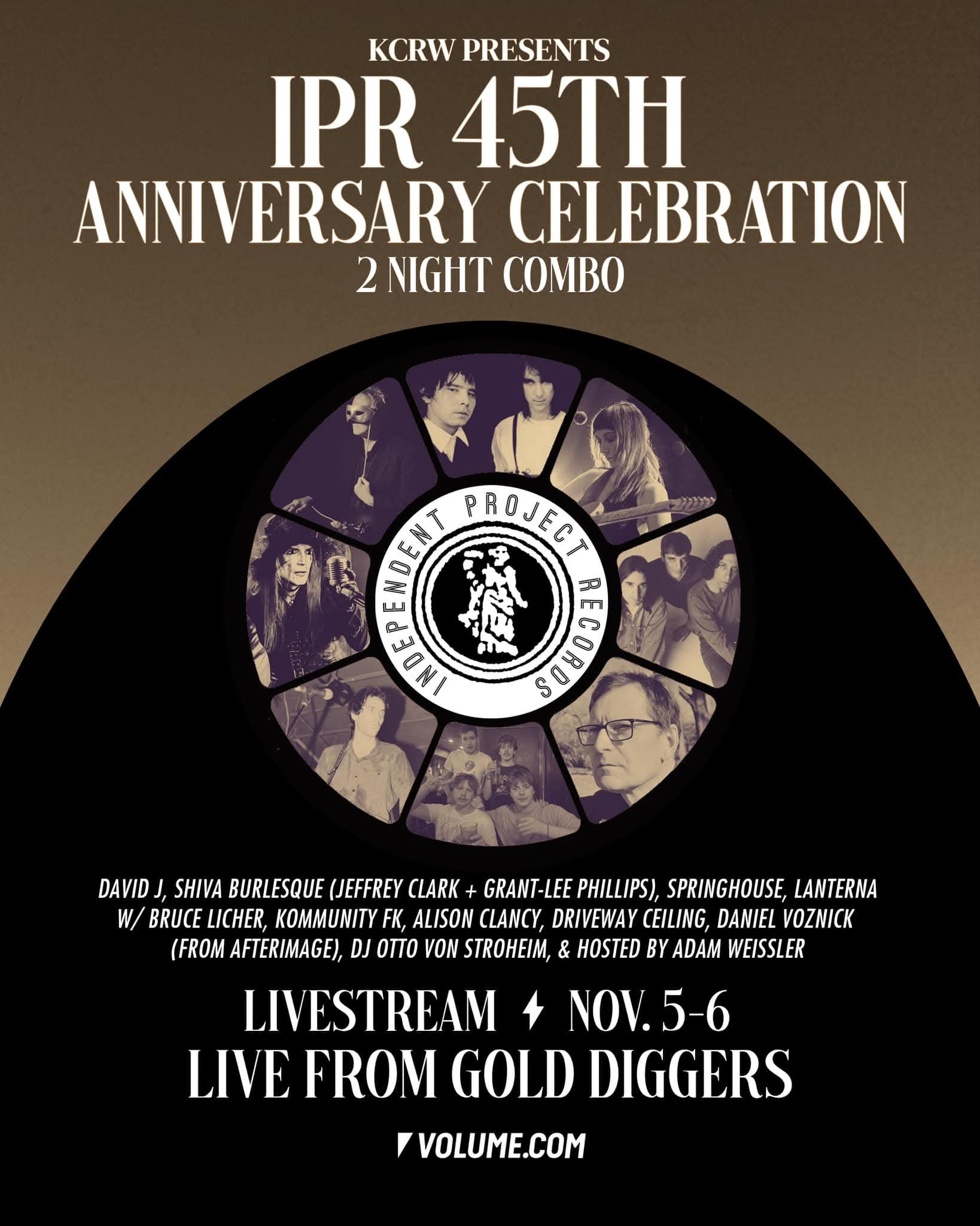For those unable to attend in person, Live Streaming Ticket Packages have been made available. Visit Volume.com for more information or to purchase Live Streaming Tickets for the Independent Project Records 45th Anniversary Live Show, a Jam-Packed Two-Night Event on November 5 & 6 at Gold-Diggers in Los Angeles – Presented by KCRW.