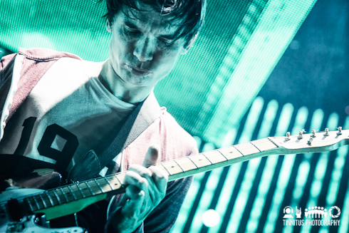 Touring on their latest record, The King Of Limbs, underscored just where the band is at the moment. A bold move was adding Clive Deamer, notable for his work with Portishead and Robert Plant among others, and together with Phil Selway, the two chrome-domed drummers stamped out a meticulously buttressed sound. It wasn’t like the two-fisted (or is it four?) approach of multiple drummer bands such as Kylesa or The Doobie Brothers; instead, the two men meshed effortlessly with intricate, complementary parts on songs such as “Separator,” “Bloom” (with Jonny Greenwood also keeping beat with a snare anchored at stage left) and especially the new song “Identikit.” Of all the band members affected by Thom Yorke‘s shift in musical vision, Greenwood would have to be the most impacted, as he was emasculated from ripping off awesome riffs and leads as demonstrated on most of the pre-Kid A material. Now he’s a seldom used guitar slinger who played half the songs on drums, keyboards, or otherwise playing the guitar unconventionally, such as using a bow during the opening of “Pyramid Song.” One wonders if he plays Guitar Hero non-stop when he’s on the tour bus.